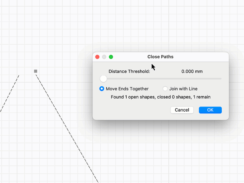 Close selected paths with tolerance works similarly to Close Path to close shapes with start and end points that are not the same, while providing greater control over how far apart they must be in order to connect them, and how they will be connected.