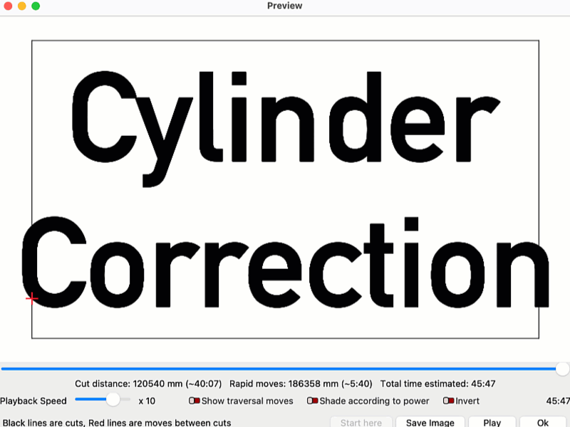 Available for Galvo lasers only, Cylinder Correction is a special mode that warps the output of your design to correct for distortion caused by engraving cylindrical objects, without using a rotary. EZCAD users may be familiar with this tool by the name ProjectMark.