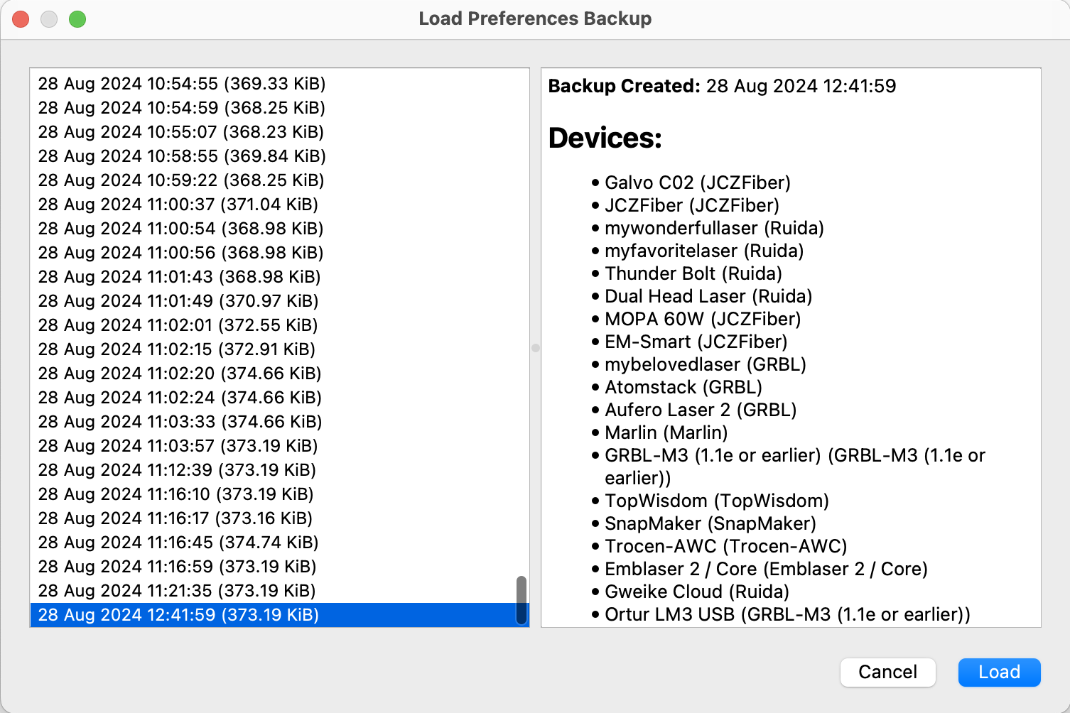 The Load Prefs Backup command allows you to import preferences from a timestamped list of automatic backups. Click a backup in the list to see the list of Devices available in that backup, on the right side of the window.