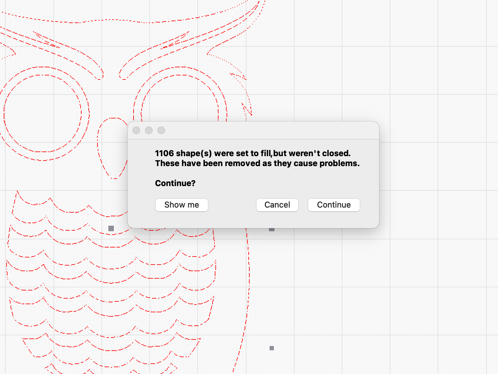 If you have open shapes set to a Fill or Offset Fill layer, and attempt to Preview or Start a job, LightBurn will warn you, and give you the option to click Continue and proceed with the job, removing the open shapes, or Show Me to automatically select them.