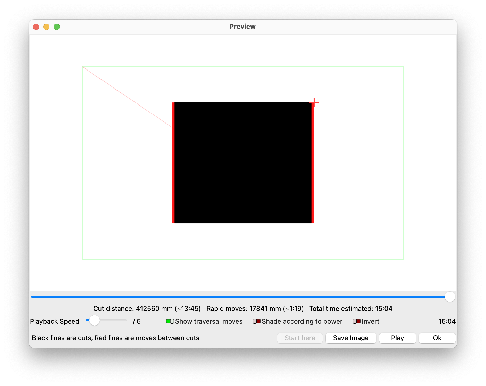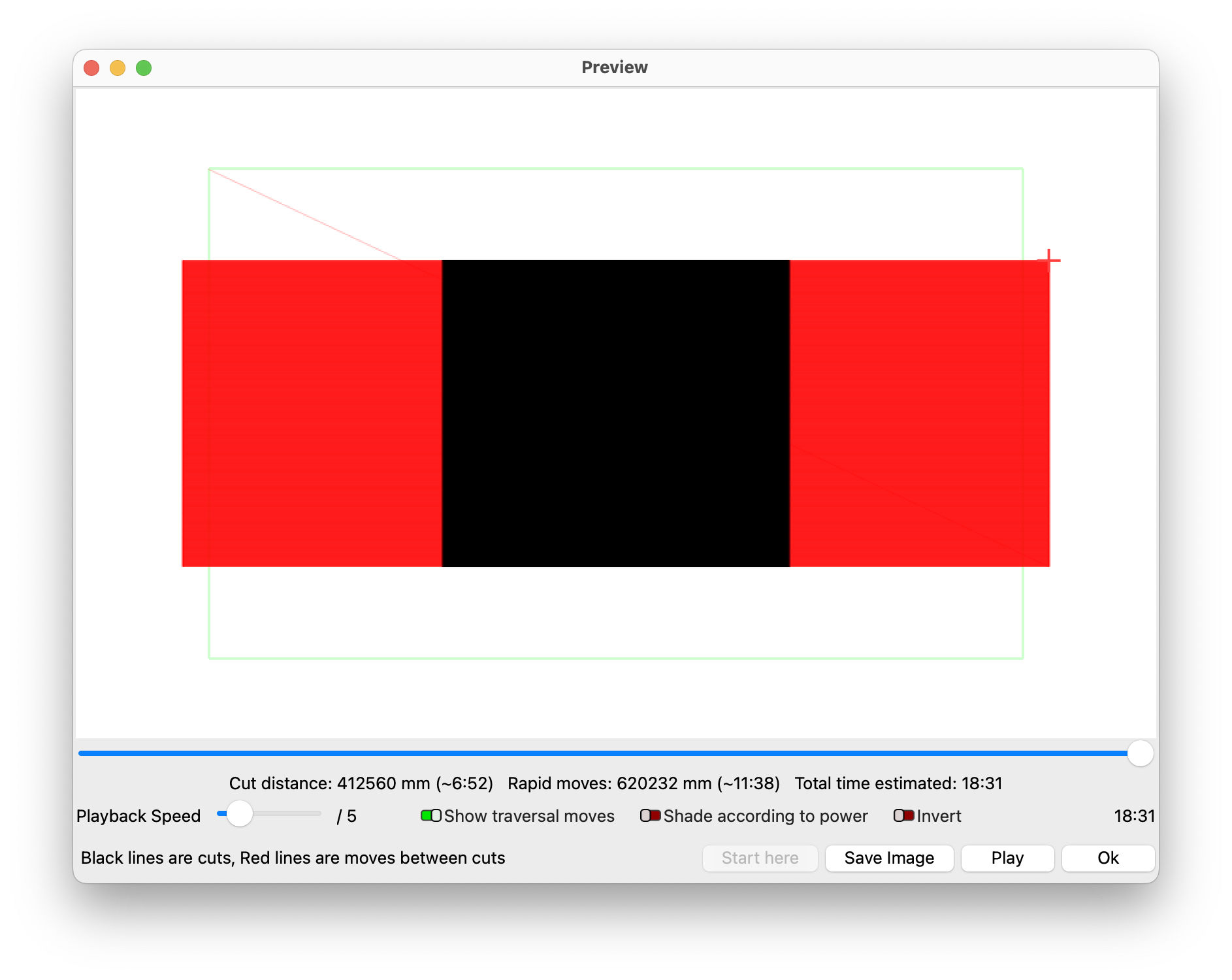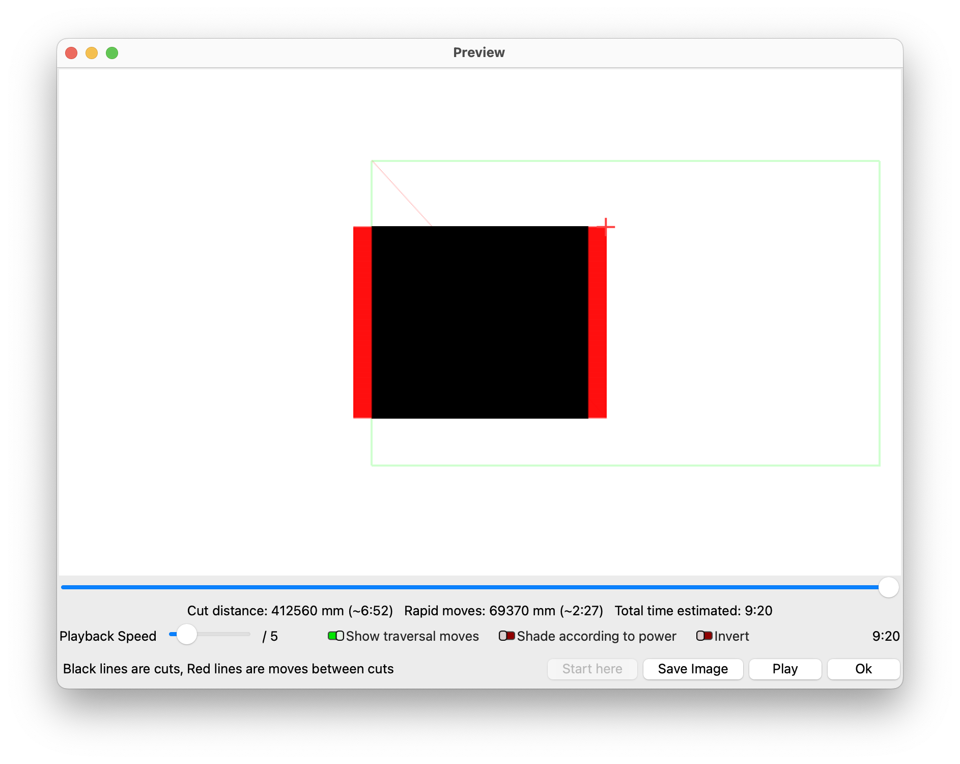 If the red lines cross the green border on two sides, no matter which Start From mode is selected, it means the Overscanning distance is excessive, and will command your laser to travel outside its physical bounds.