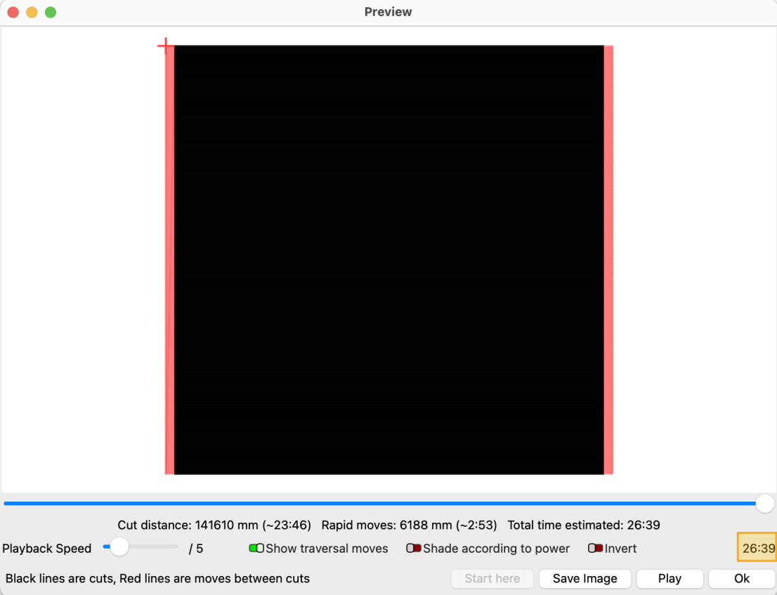 By giving your laser extra room to accelerate and decelerate with the laser off, you can ensure that it only fires once it's reached the full Speed you set it to engrave at, resulting in an even burn across the entire engraved area.