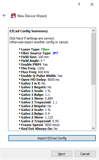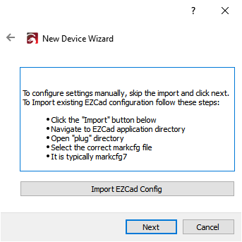 If your settings were provided on a card, in an email, or in any other way that doesn't work with the automatic importer, click Next when asked to import the EZCAD config to skip this step, and enter your settings manually after adding the laser.