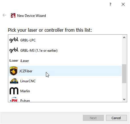 Follow the directions in Find My Laser to begin the process of adding your Galvo laser. Your laser should be detected as JCZFiber (for EZCAD2 devices) or BSLFiber (for SeaCAD devices). Select the appropriate device and connection type – USB is currently the only supported type for Galvo devices – and continue with the process.