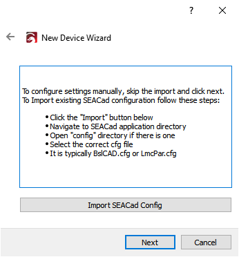The New Device Wizard will ask you to import a configuration file. The name and expected location will vary depending on the type of Galvo laser you've selected: