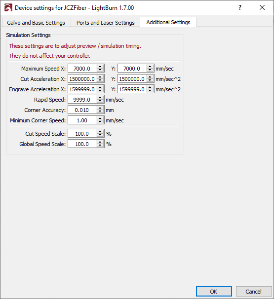 Go to Edit → Device Settings to open the Device Settings window. From here, you can manually enter the settings provided by the manufacturer in the Galvo and Basic Settings tab and the Ports and Laser Settings tab.