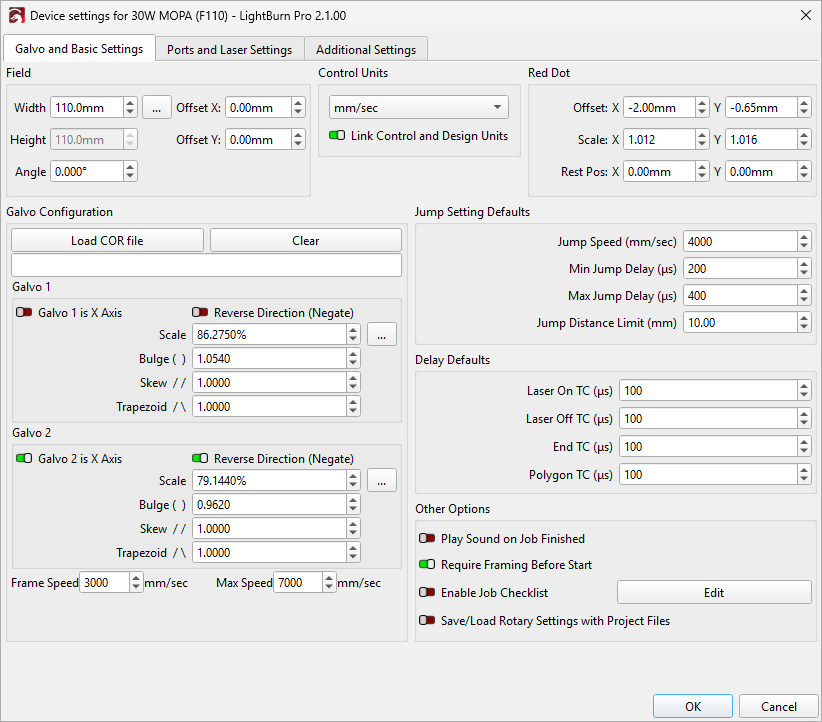 If your markcfg7 file includes information about Lens Correction, LightBurn will attempt to automatically import this for you. If your configuration file doesn't include this info, you'll need to manually enter it in Device Settings after finishing the New Device Wizard.