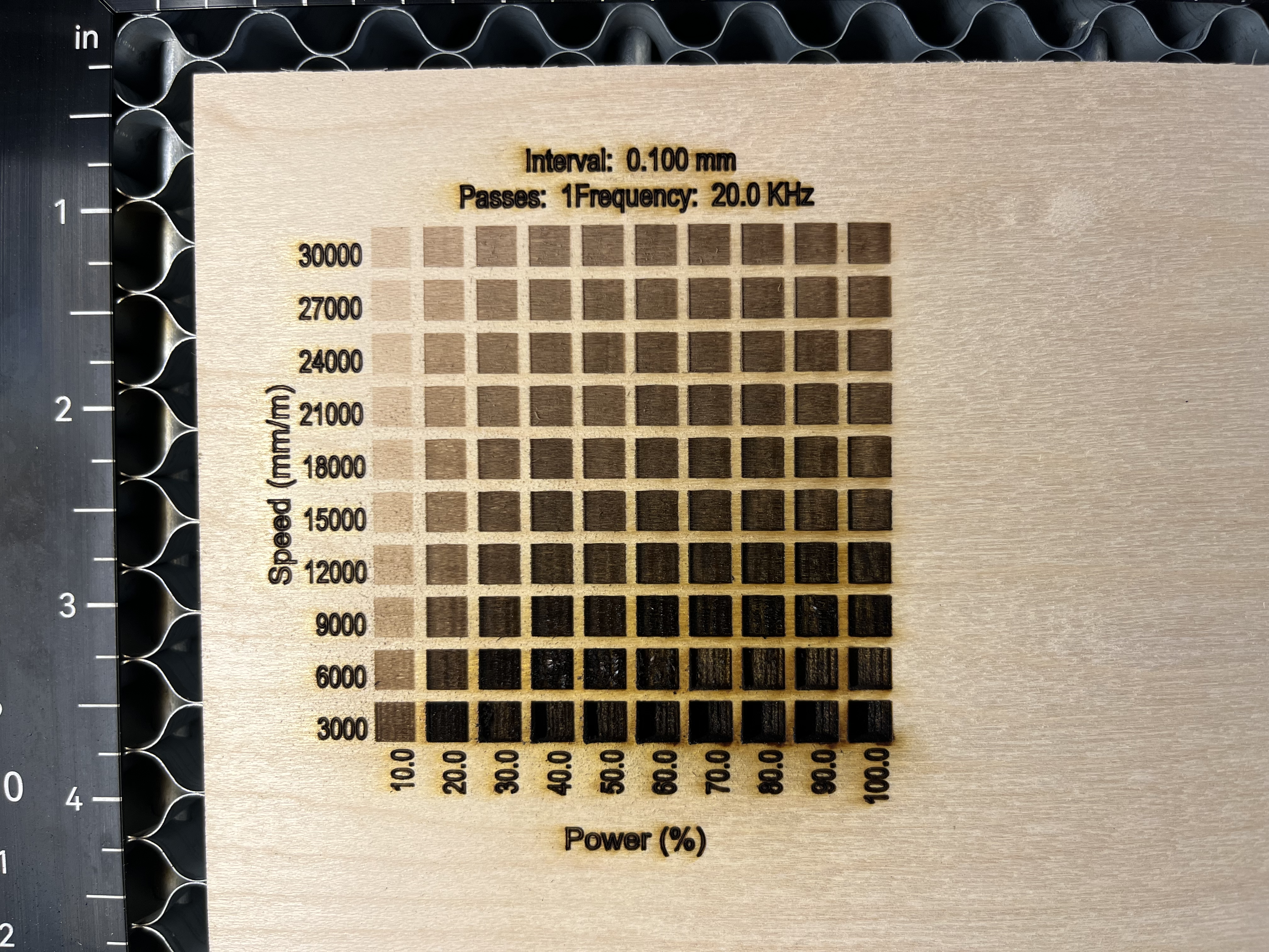 When it's finished, examine the results. You're looking for the box that cuts through the most cleanly, without charring. If several cut through with similar amounts (or lack of) charring, you can select the one that achieved a clean cut at the fastest speed.