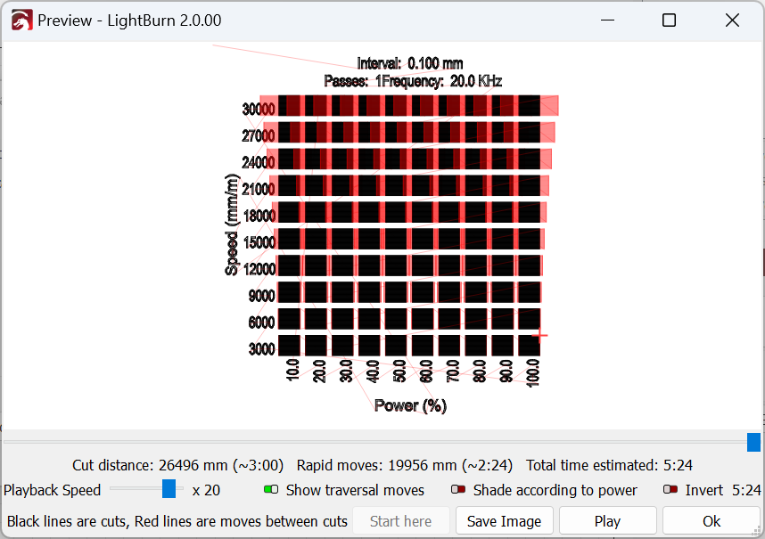 LightBurn has a built-in Material Test that you can use to test different combinations of Speed, Power, Passes, Line Interval, and other settings. The Material Test works by automatically setting up a grid of boxes that will be cut or engraved at a range of different settings.