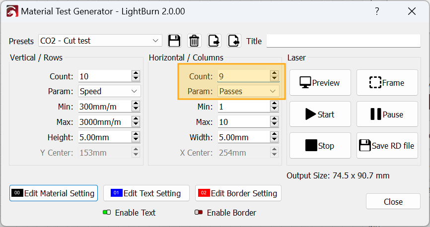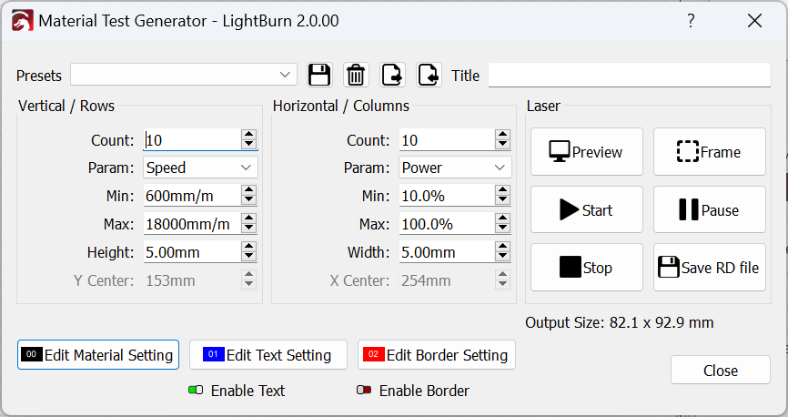 LightBurn will automatically populate the Material Test fields with a range of values that should provide a good starting point for almost all lasers of your selected type.