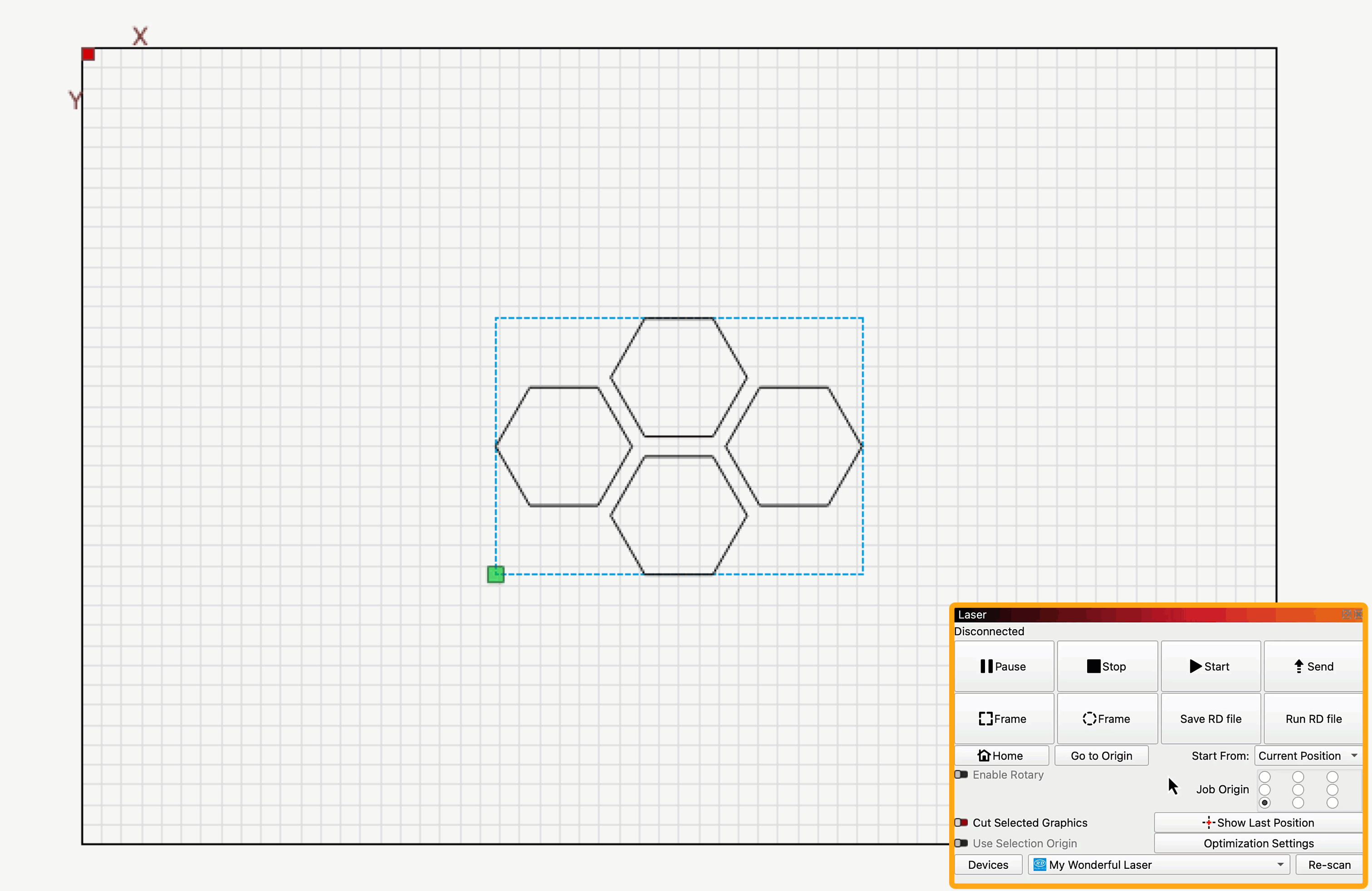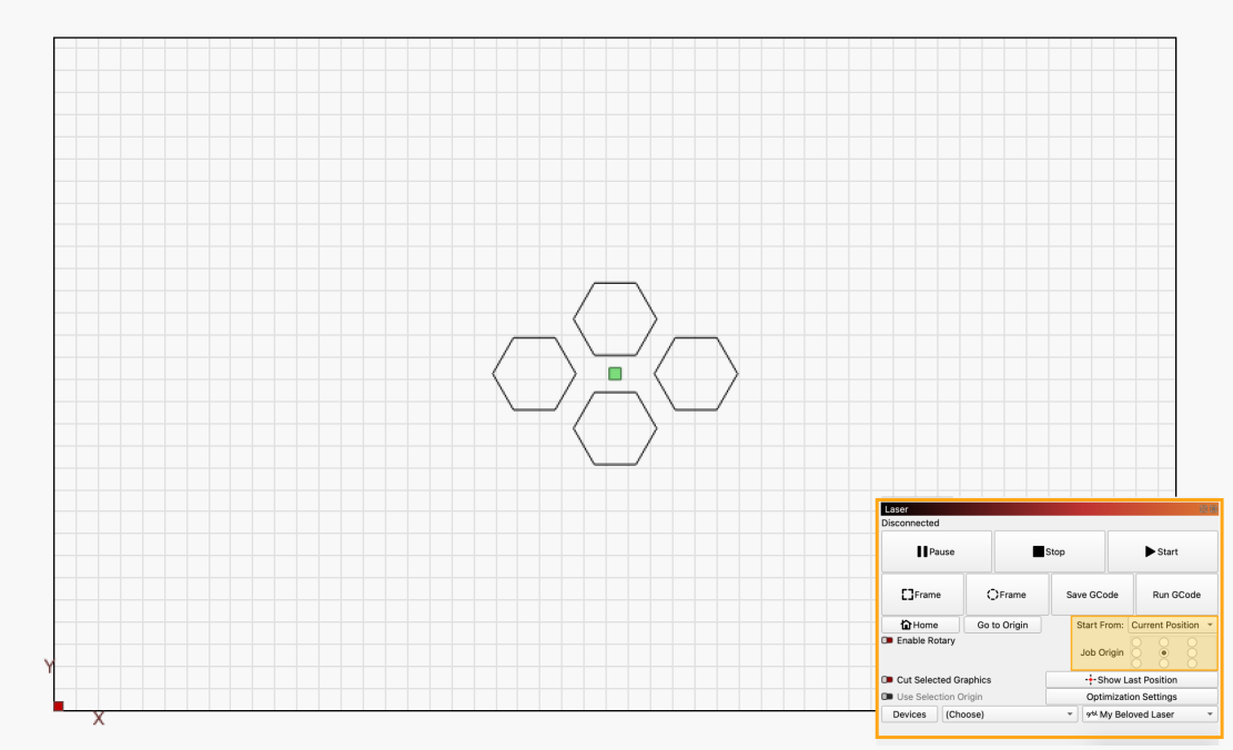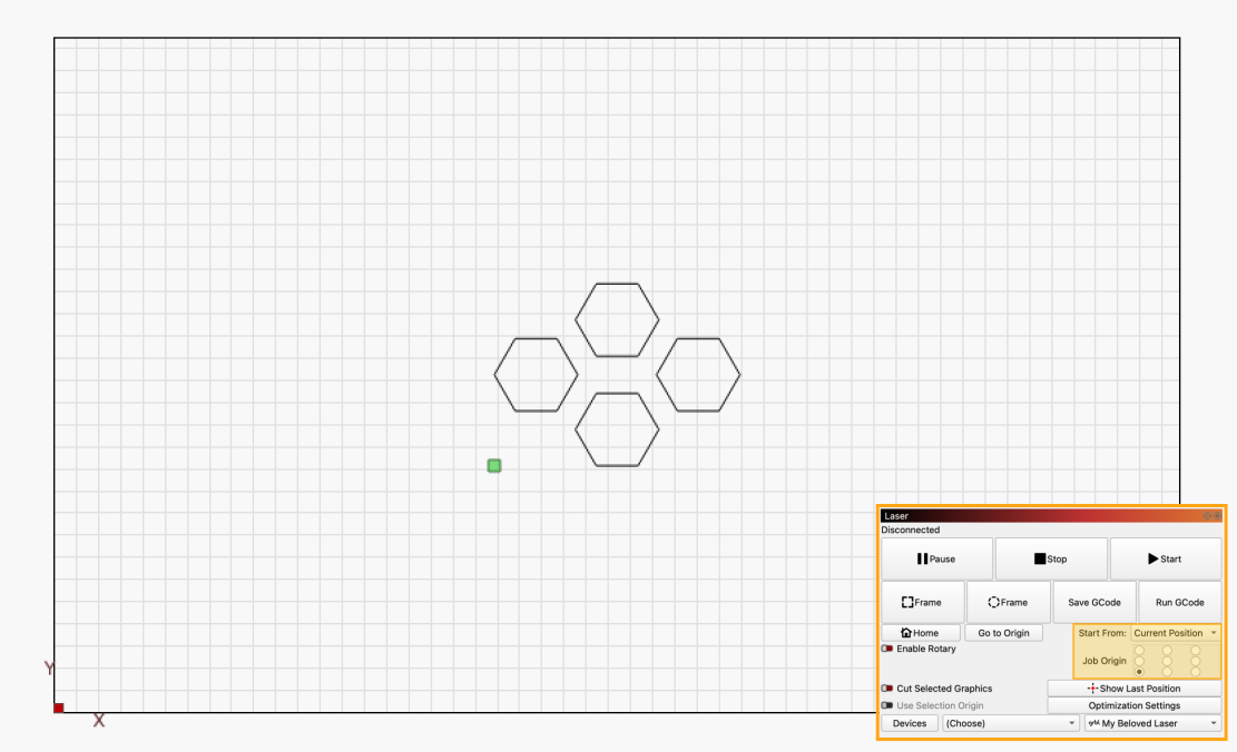 Notice the location of green Job Origin indicator. This represents the position of the laser when you start the job, so the laser is going to move slightly up and to the right from wherever it is, cut the four hexagons, and go back to where it started.