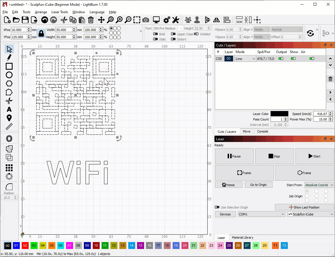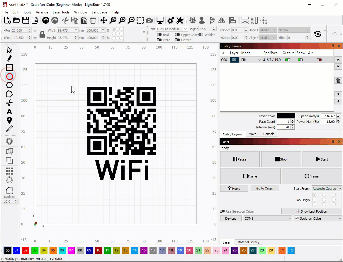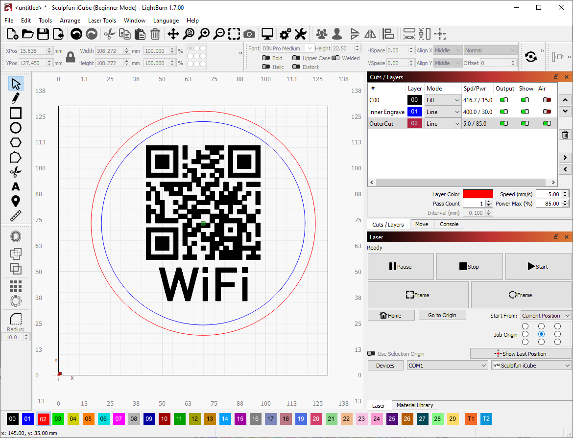 One of the best ways to learn to use Lightburn is to use it. We recommend following along with our laser-engraved QR Code WiFi coaster to start exploring LightBurn. By the end, you'll be familiar with LightBurn's user interface and general workflow, and you'll have a coaster your friends and family can scan to log into your WiFi network without needing to type anything in.
