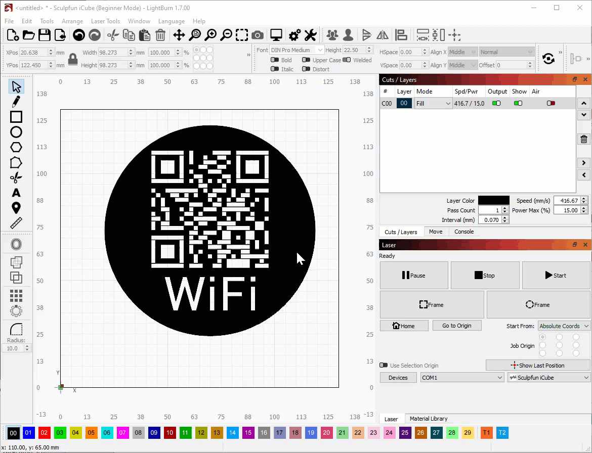 Right now, your circle is on the same layer as the QR Code and text. This means it'll be filled in like them as well. We'll need to move it to a different layer and give it its own cut settings.