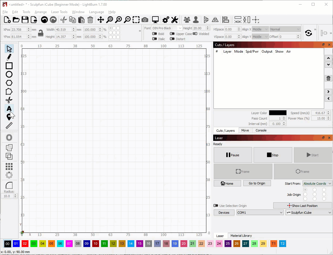 Open the Preview window with Alt/Option+P. This window shows your design as it will be sent to the laser, and can even simulate the engraving to estimate time and visualize what the laser will be doing. Try pressing play to see how it works.