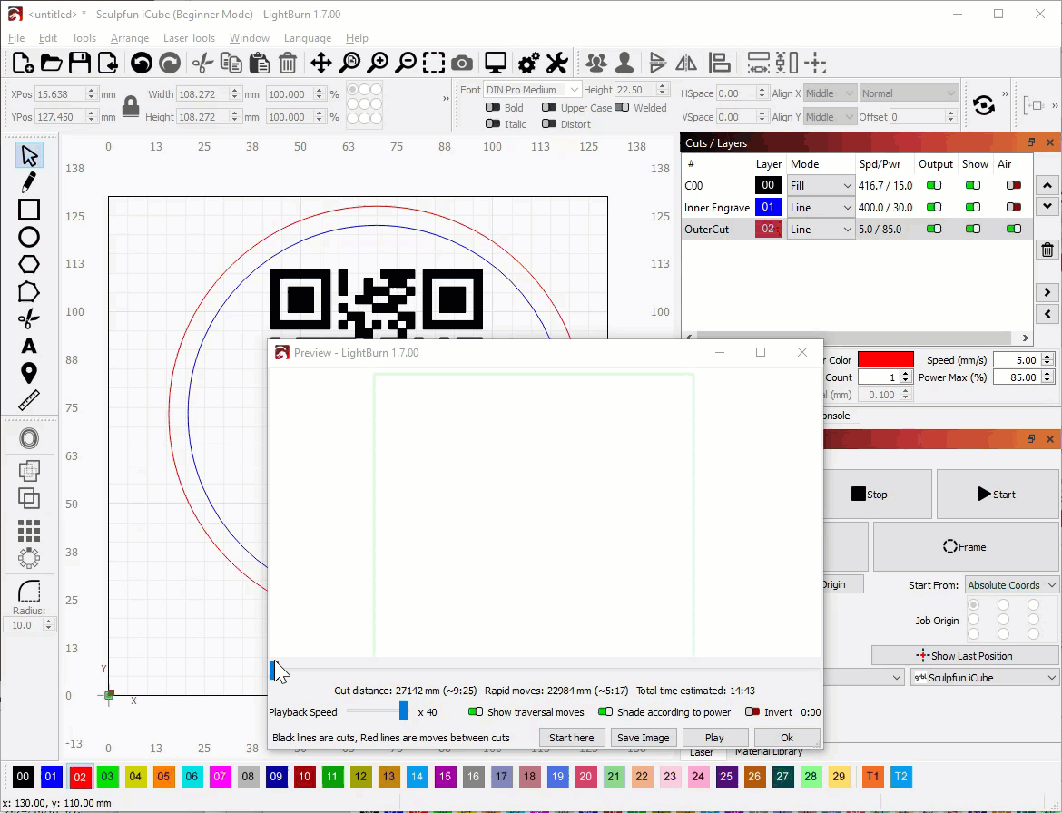Now that your design is complete, preview it one more time. Remember that you can open the Preview window with Alt/Option+P. Press Play to preview what your laser will do. You can use the slider at the bottom to speed up or slow down the simulation.