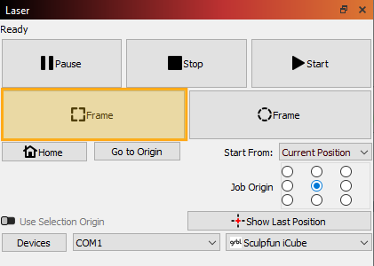 - Set Start From to Current Position using the dropdown in the Laser Window.