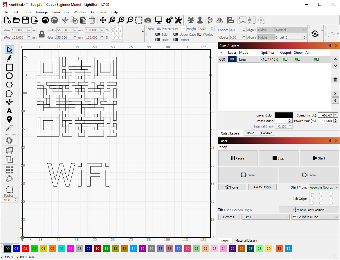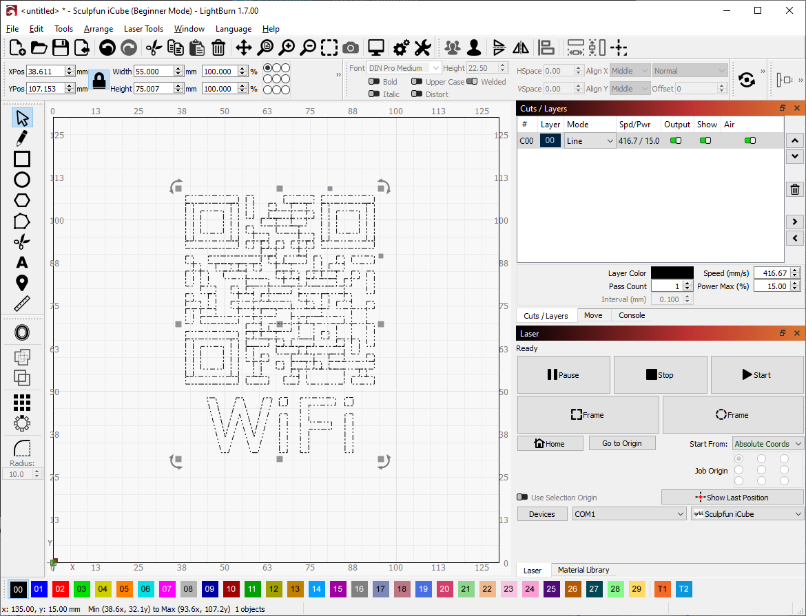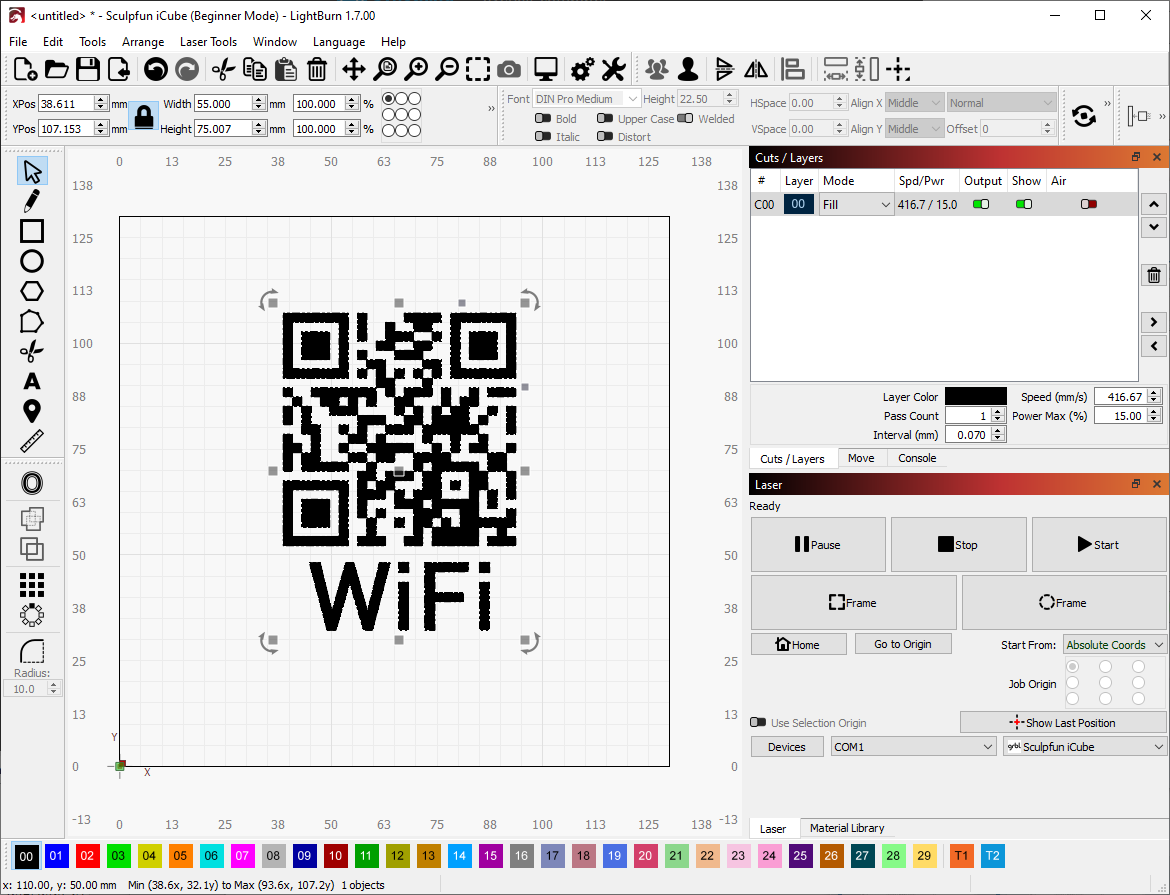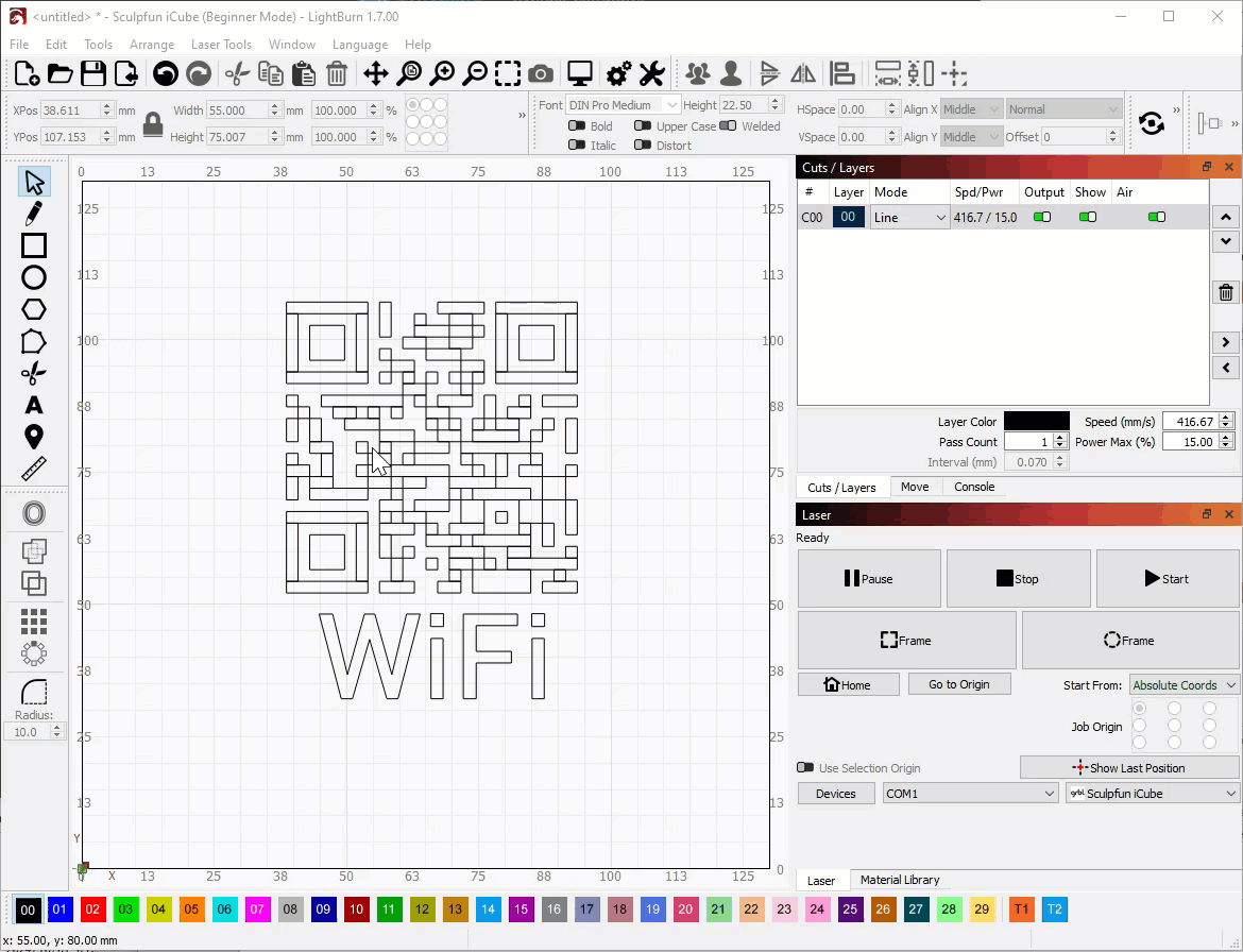 LightBurn has a built-in Bar Code tool, which can generate QR Codes as well as a variety of other scannable codes. You'll use this to generate a QR Code that automatically logs someone into your WiFi network.