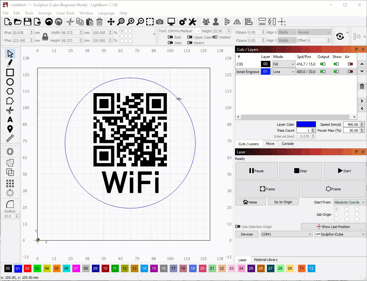 - Preview your design. Your QR Code and text should still be filled in, but the circle should be just a line that the laser travels along.