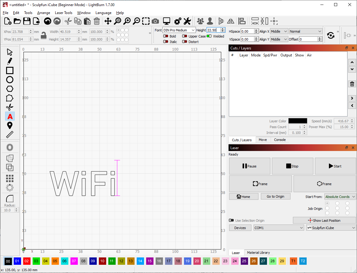 in the Creation Toolbar. - Click in the Workspace to place a cursor and type something out. Our demo coaster will say "WiFi", since that's what the QR Code will be for.