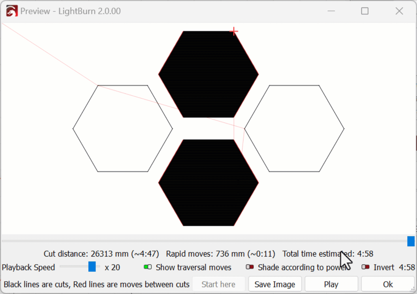 You'll also see red lines — these lines indicate the path your laser will travel while not firing. You can toggle Show traversal moves at the bottom of the Preview window to switch between showing these moves or not.