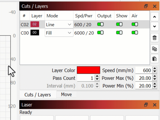 If your laser has an air assist, keep the Air switch on to enable air assist for this layer. Air assists are helpful during cutting operations.