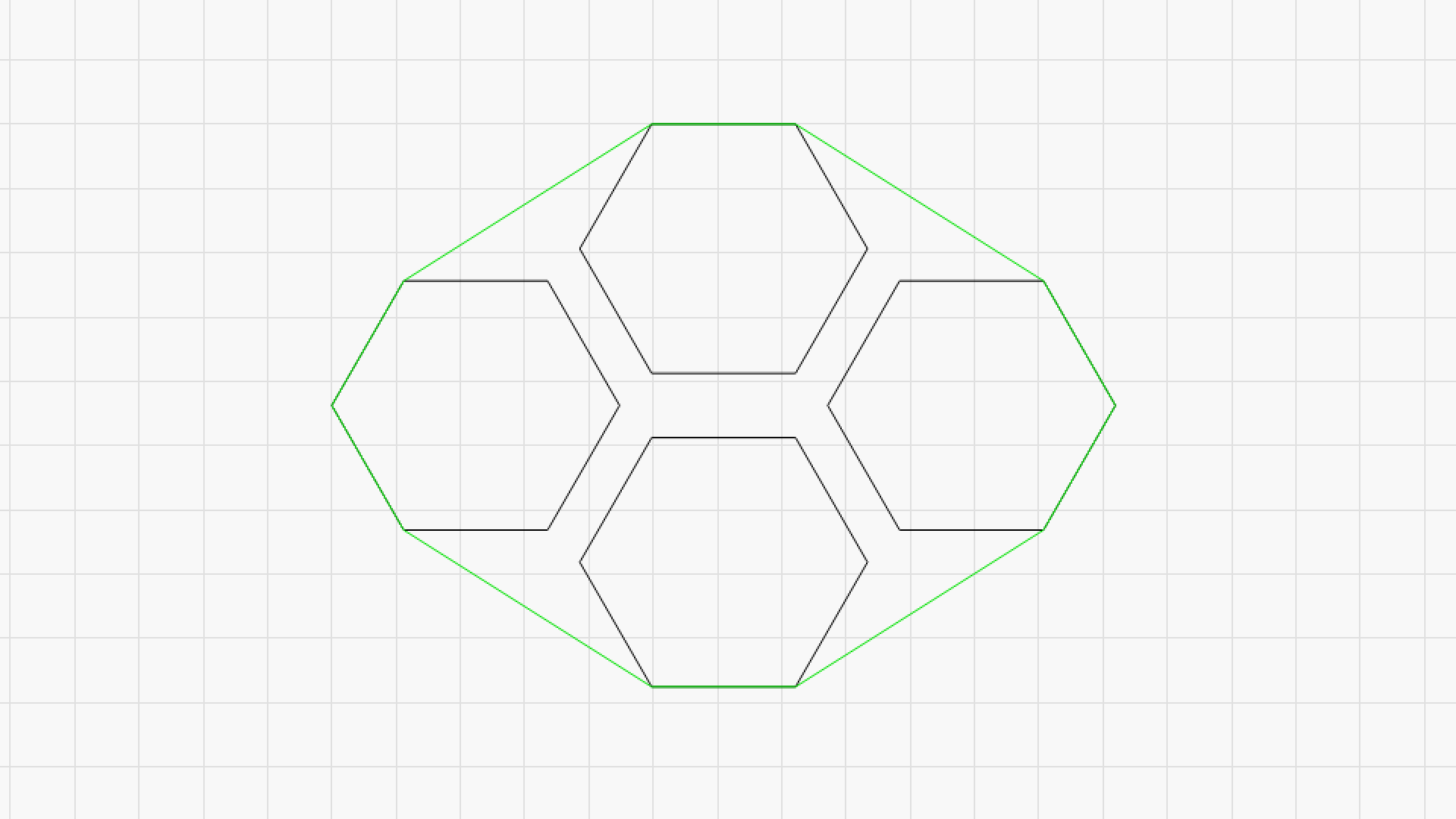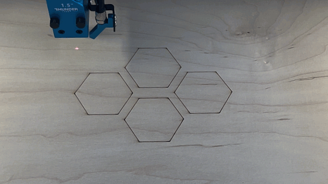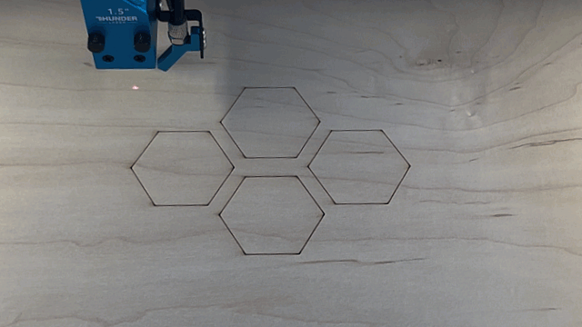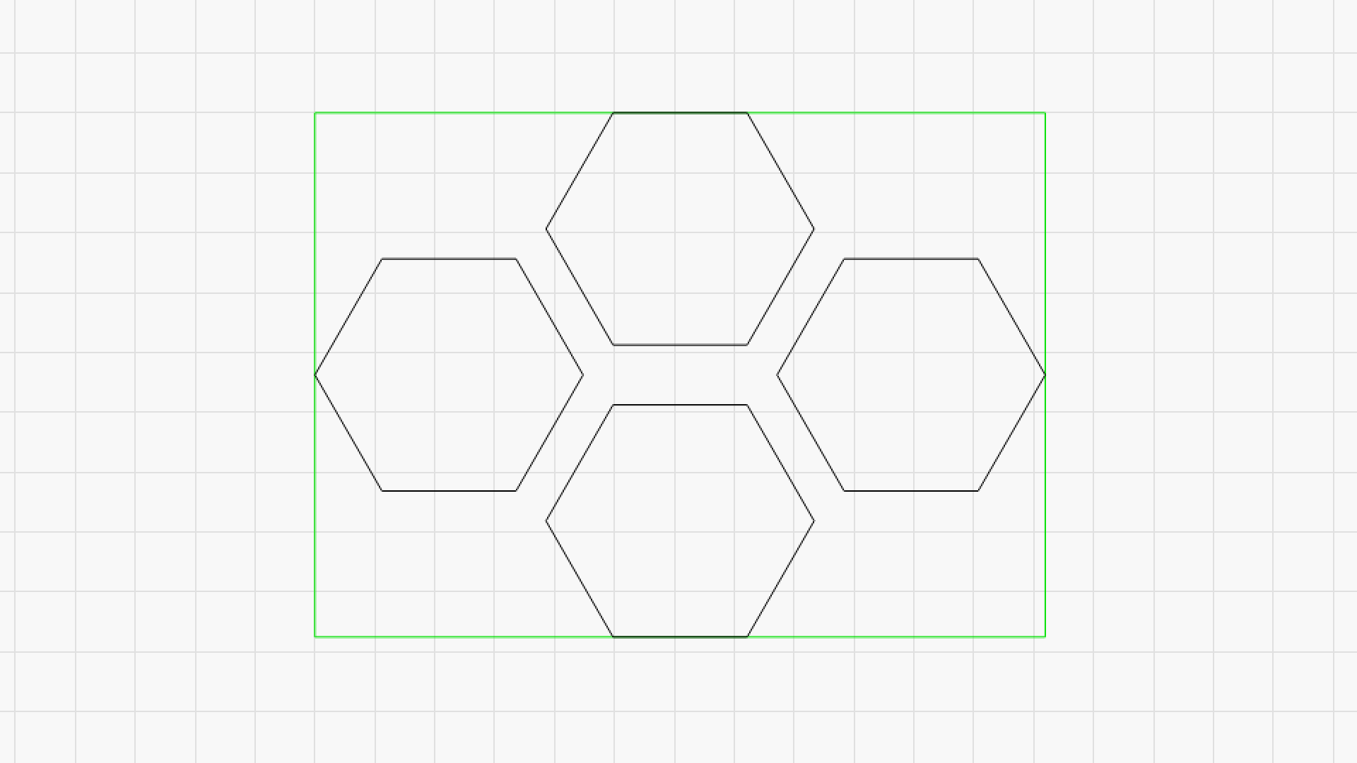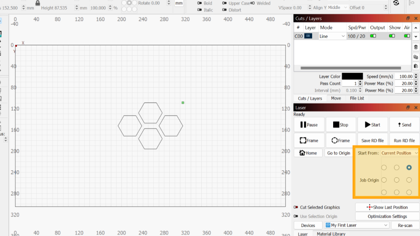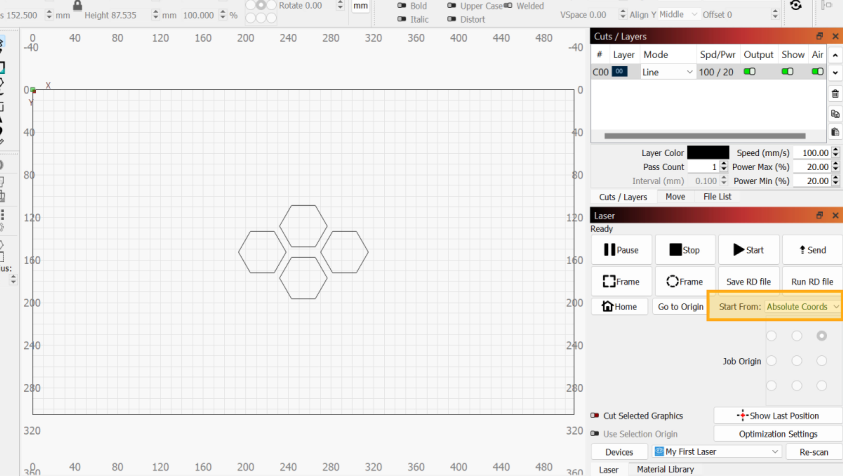 In the first example, we have Absolute Coords selected, and our four hexagon design placed directly in the center of the LightBurn Workspace, so when we press the Frame button, the laser traces a rectangle in the exact center of its work area: