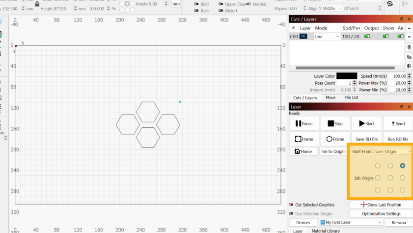 Finally, here's User Origin and a top right Job Origin — prior to Framing we'll jog the laser to the top right of its work area, then set the origin (in this case, we used a DSP laser and set the origin from the controller).