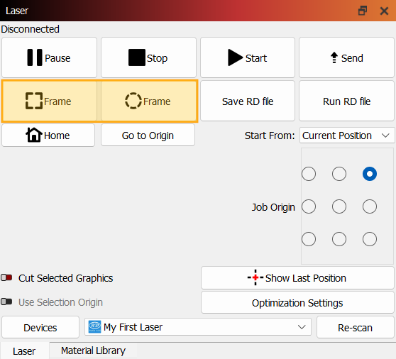 There are two Frame buttons in the Laser Window — clicking either will command your laser to trace a path around the area where your project will output.