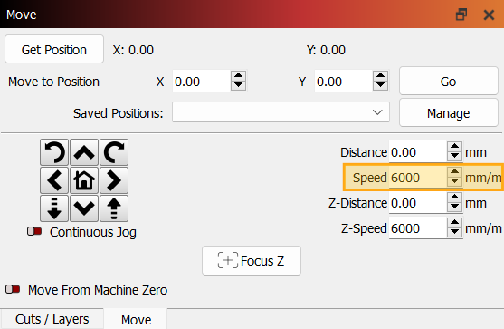 The speed at which the laser travels during Framing is determined by the value set in the Speed field in the Move Window.