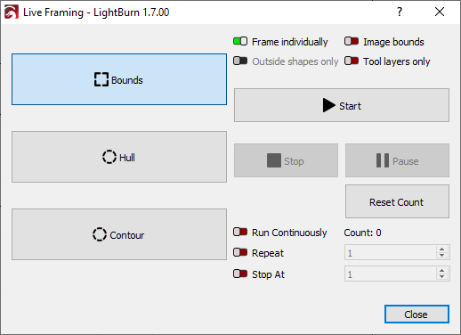 Click the Frame button in the Laser Window or press F1 to open the Live Framing window and start framing your job.