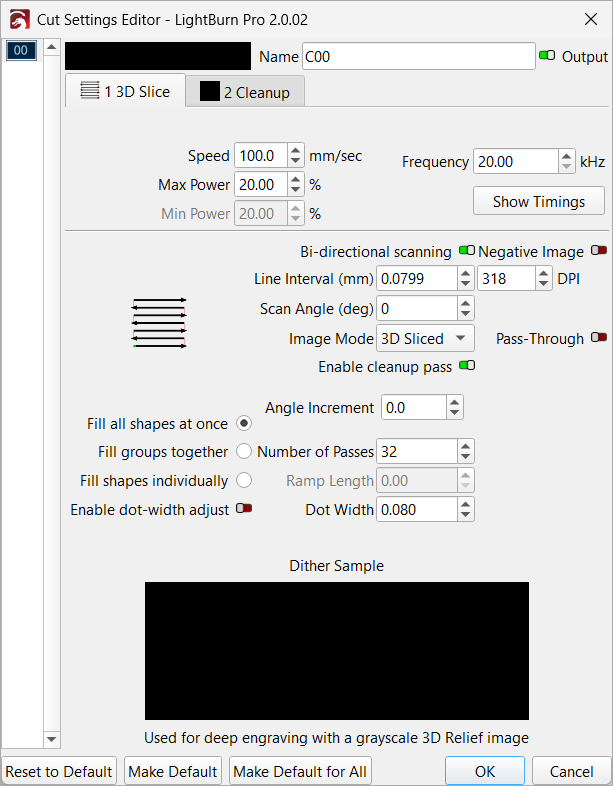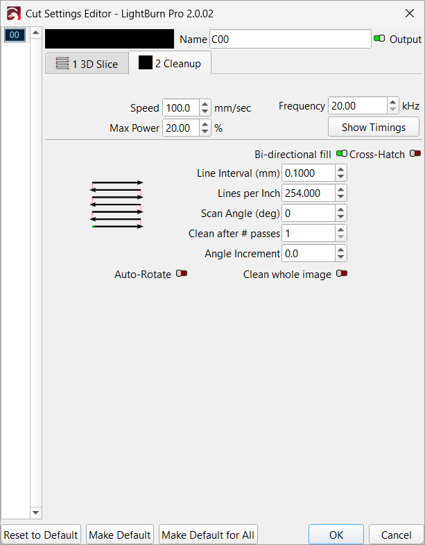 Cleanup passes are typically run with a tighter Line Interval, higher Frequency, and lower Max Power than the main engraving passes, and are used to clear debris and produce a better finish.