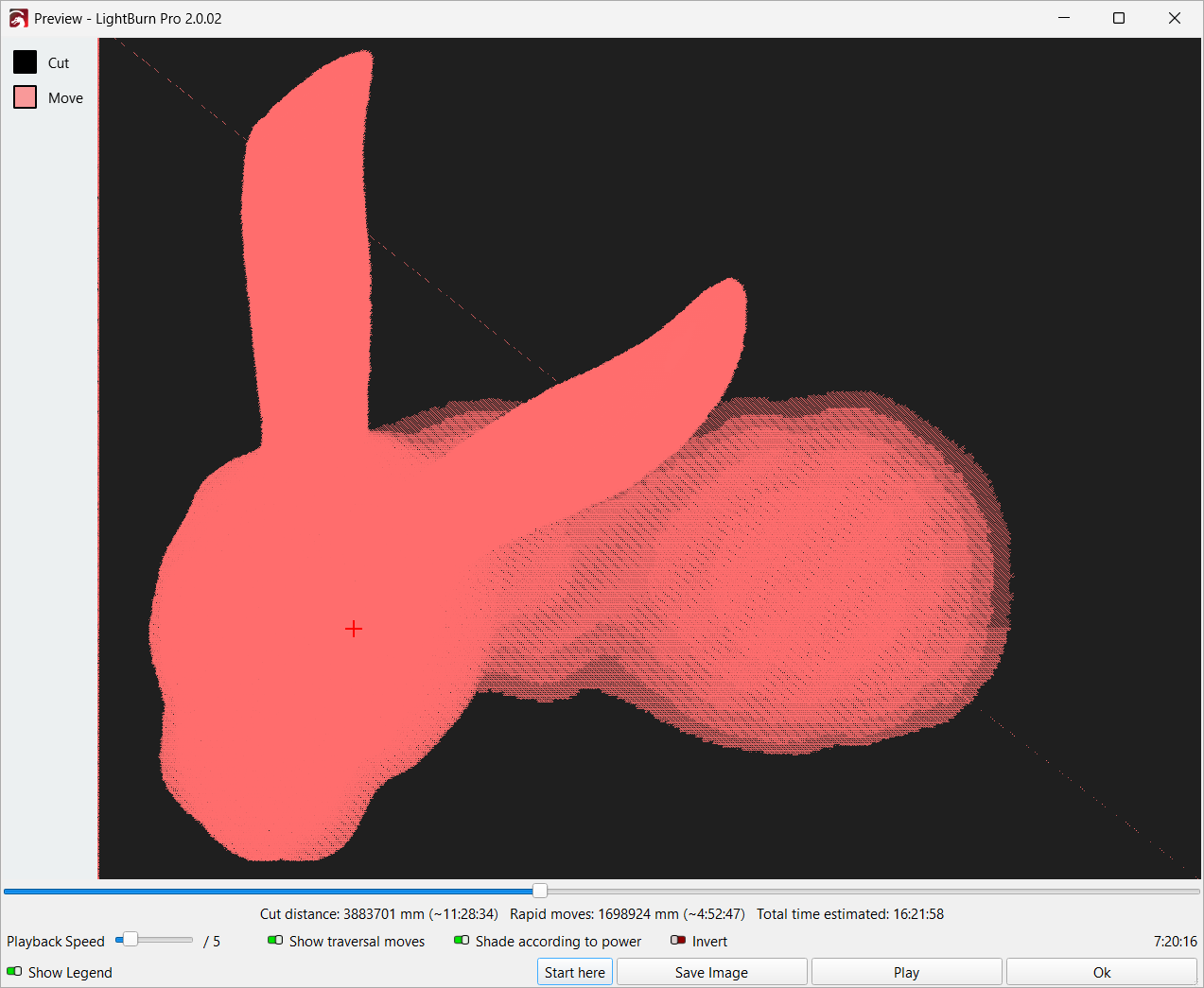 Enable Show traversal moves and check to make sure that the red areas expand with each pass. The red areas are made up of lines indicating movements made while the laser is off, so, as the job progresses, the laser should be passing over increasingly large areas of lighter shading, while continuing to engrave increasingly small darker-shaded areas.