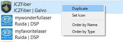 In many cases, changing the galvo lens means that you'll need to adjust many settings and recalibrate it, effectively making it a "new" machine when you do so. To duplicate a device in LightBurn, click Devices in the Laser Window, right-click on a given laser, and select Duplicate.