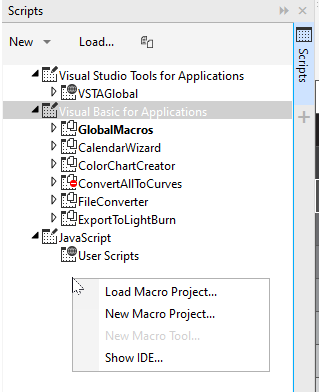 If the ExportToLightBurn macro doesn't show up in the Visual Basic For Applications category, load it manually.