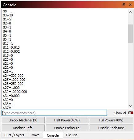Many GRBL based machines allow the settings of the machine to be easily exported or viewed. For advanced configuration like adding limit switches, updating firmware, or setting up a new controller, you'll need to interact with these values. You can do this in LightBurn by using the Console window or the Machine Settings window to copy, update, or reset your machine settings.