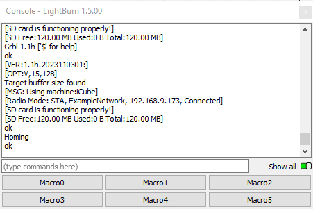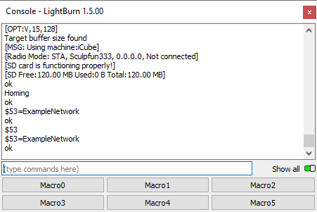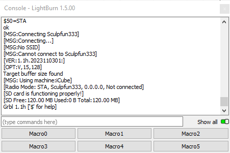 Don't worry for now if you see [MSG: No SSID] or a similar message in the Console window. This is your laser's way of telling you that it doesn't know what network to connect to yet.