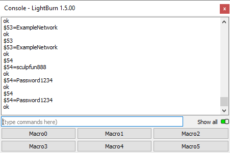 To check the value for any of these parameters before changing it, you can use the parameter without assigning a value. To change the value, add =YOURVALUE after the parameter. As an example, $53 will show the name of the WiFi network to connect to. $53=MyWifiNetwork will configure the laser to connect to a network called "MyWifiNetwork".