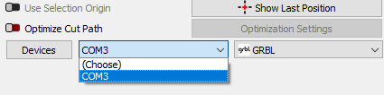 - If you see Disconnected, your device is not connected. Make sure you have the correct serial port selected (the dropdown that says COM3 in the screenshot below). If your laser still isn't connecting, select (Choose) in the same dropdown and then reselect the serial port to reset the connection. If you're still unable to connect, see Troubleshooting: Connection Problems.