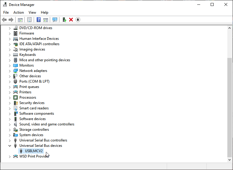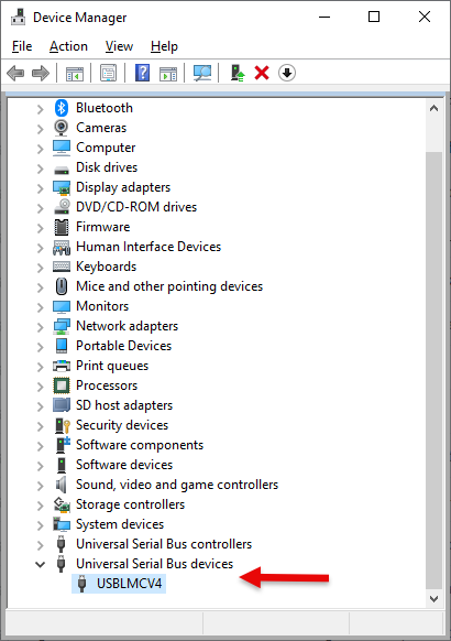 Next, find the USBLMC device in the list - it should be near the bottom, under Universal Serial Bus devices, shown below: