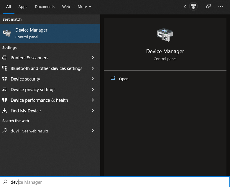 To open the Device Manager, type "device manager" in the search box on the taskbar, then select Device Manager from the menu.
