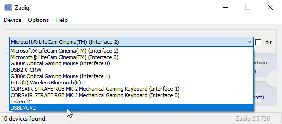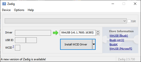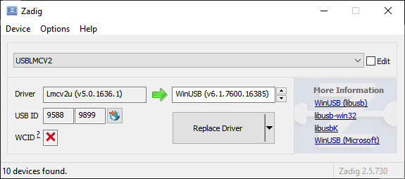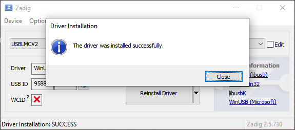 On the rare occasion that Zadig fails, try it again — it almost always works, and sometimes reports a failed installation erroneously, when it actually succeeded. You should see this: