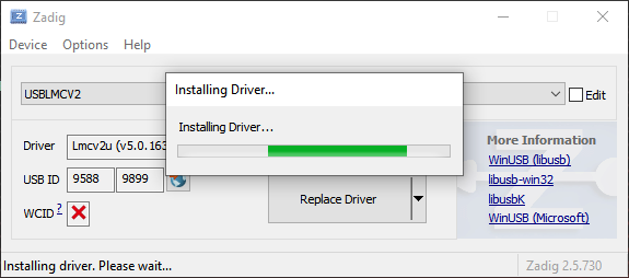 Click Replace Driver and wait for the process to complete. Make sure that you are not running EZCAD when you do this — if anything is actually using the hardware, the driver swap will likely not complete, and time-out after five minutes. If everything goes as expected, it takes about a minute, often less.