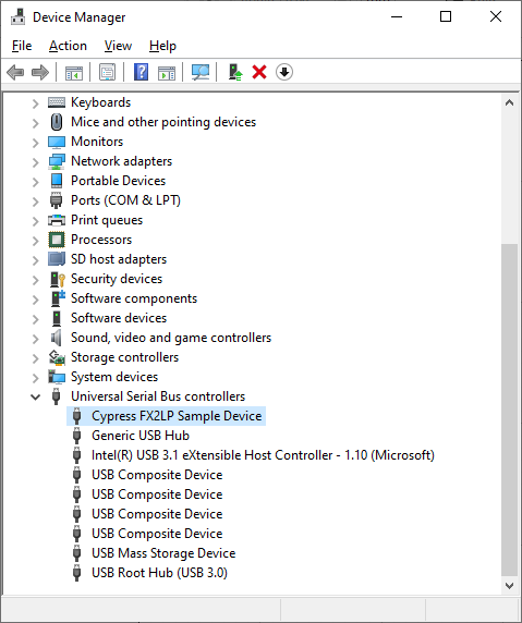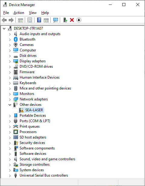 - After installing the driver, the laser will appear under Universal Serial Bus controllers as SEA-LASER (with no caution/warning symbol), Cypress FX2LP Sample Device, or something else similar.