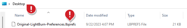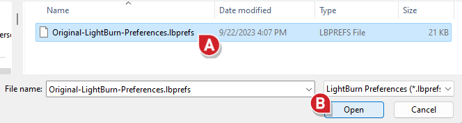 Open LightBurn and export your current preferences by going to File → Preferences → Export Prefs.