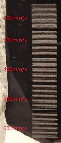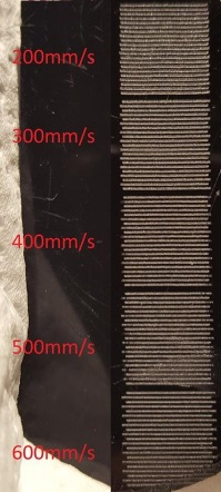 5. Run the rectangle at multiple Speeds. At least two will be required for this process, but using more will improve the quality of your results. Make sure you use speed settings your laser is capable of reaching, and keep track of the speed used for each run. The exact speed settings you use will depend on your machine, but you should test several different speeds representing a range of speeds your laser can achieve.
