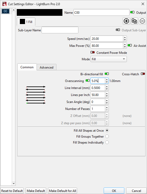 4. If you are on a GCode based device, enable Overscanning, and set it to 5% or greater to be sure the machine is not slowing down before reaching the ends. (Ruida devices overscan automatically).