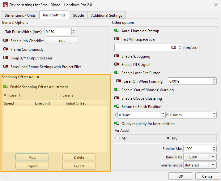 If your laser manufacturer provided a .lbso file or you've exported your own settings, skip ahead to Importing and Exporting Scan Offset Settings.