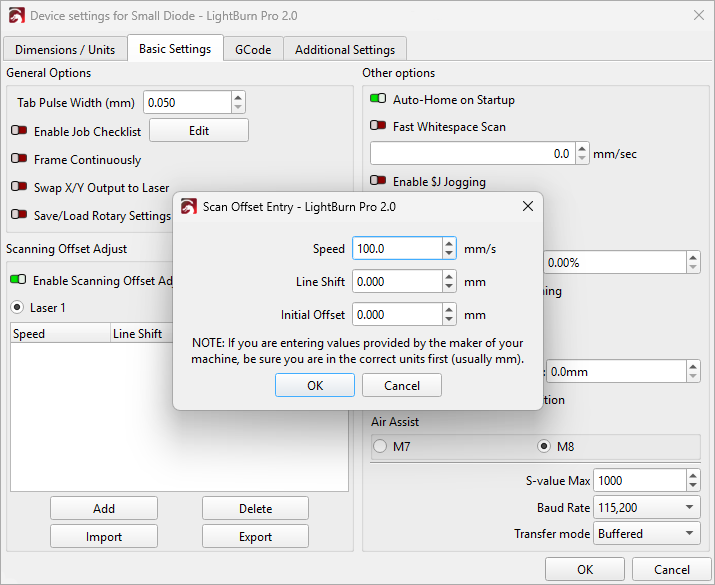 7. In the Scanning Offset Adjust section of the Device Settings window, click Add to enter the Speed and Line Shift (distance between ends of lines) values into the Scanning Ofset Adjustment table. LightBurn will use this information to compute the correct adjustments for other speeds as well. The Initial Offset value is generally not needed, but can be used to shift the entire engraving left or right if needed to compensate if your engravings are shifted relative to vector cuts or engravings.