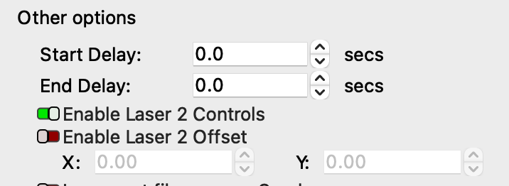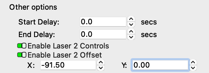 The X and Y fields beneath the Enable Laser 2 Offset switch in the Device Settings window are used to compensate for the distance between two laser heads. By shifting output to the 2nd laser head by specified X and Y values, output from Laser 2 will line up with output from Laser 1.
