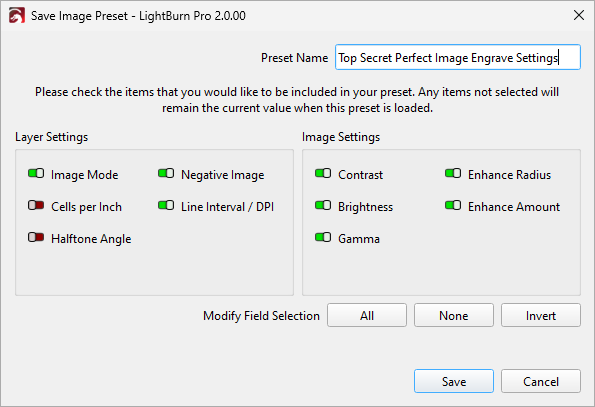 You can choose which Layer and Image Settings are included in the Preset by toggling the switches next to each option.